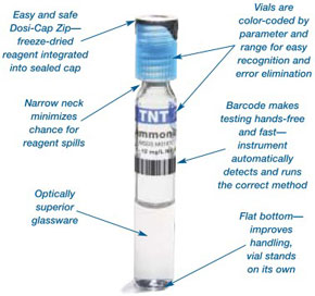 Với TNTplus, HACH sử dụng nắp Dosicap. Thuốc thử dạng bột được nén chính xác đến từng miligam bên trong nắp và được bảo vệ bởi một lớp màng ngăn. Khi sử dụng, người dùng chỉ cần vặn ngược nắp hoặc nhấn xuống, hóa chất sẽ rơi thẳng vào ống nghiệm. Điều này giúp loại bỏ hoàn toàn: