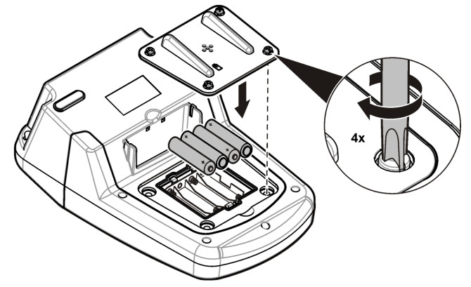 - Máy sử dụng nguồn là 4 pin kiềm AA hoặc pin sạc NiMH để hoạt động. Đảm bảo pin được lắp vào đúng cực. Tham khảo hình đưới đây về việc lắp pin.